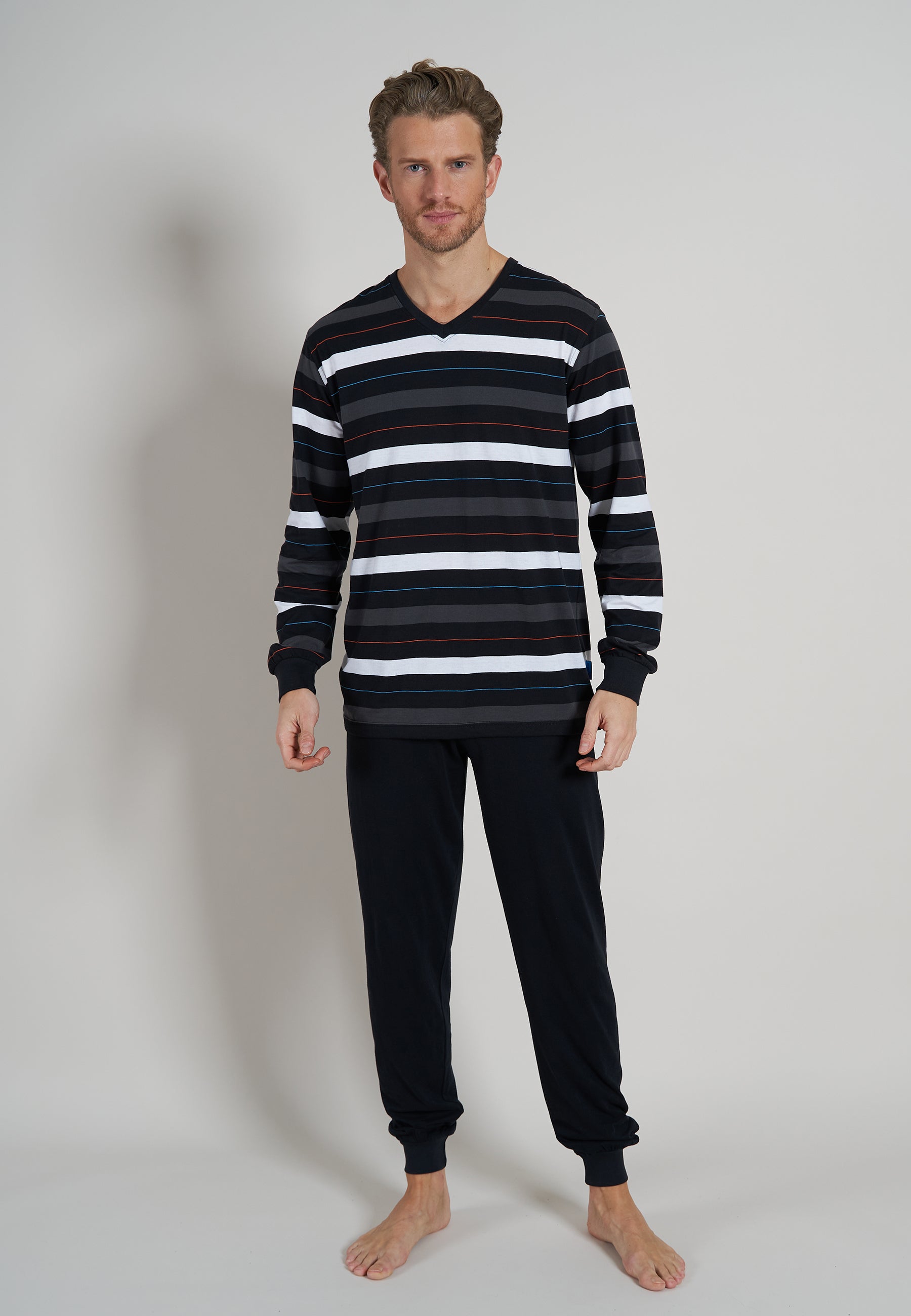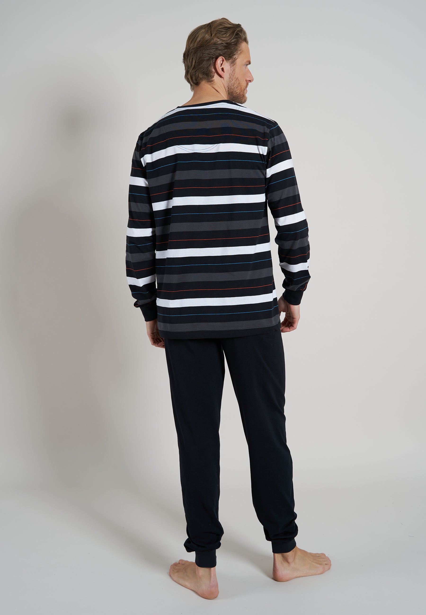 Heren pyjama van het merk Ceceba. De top heeft lange mouwen en een ronde hals en is gestreept. De broek is voorzien van een elastische tailleband. De set is gemaakt van een katoenmix.