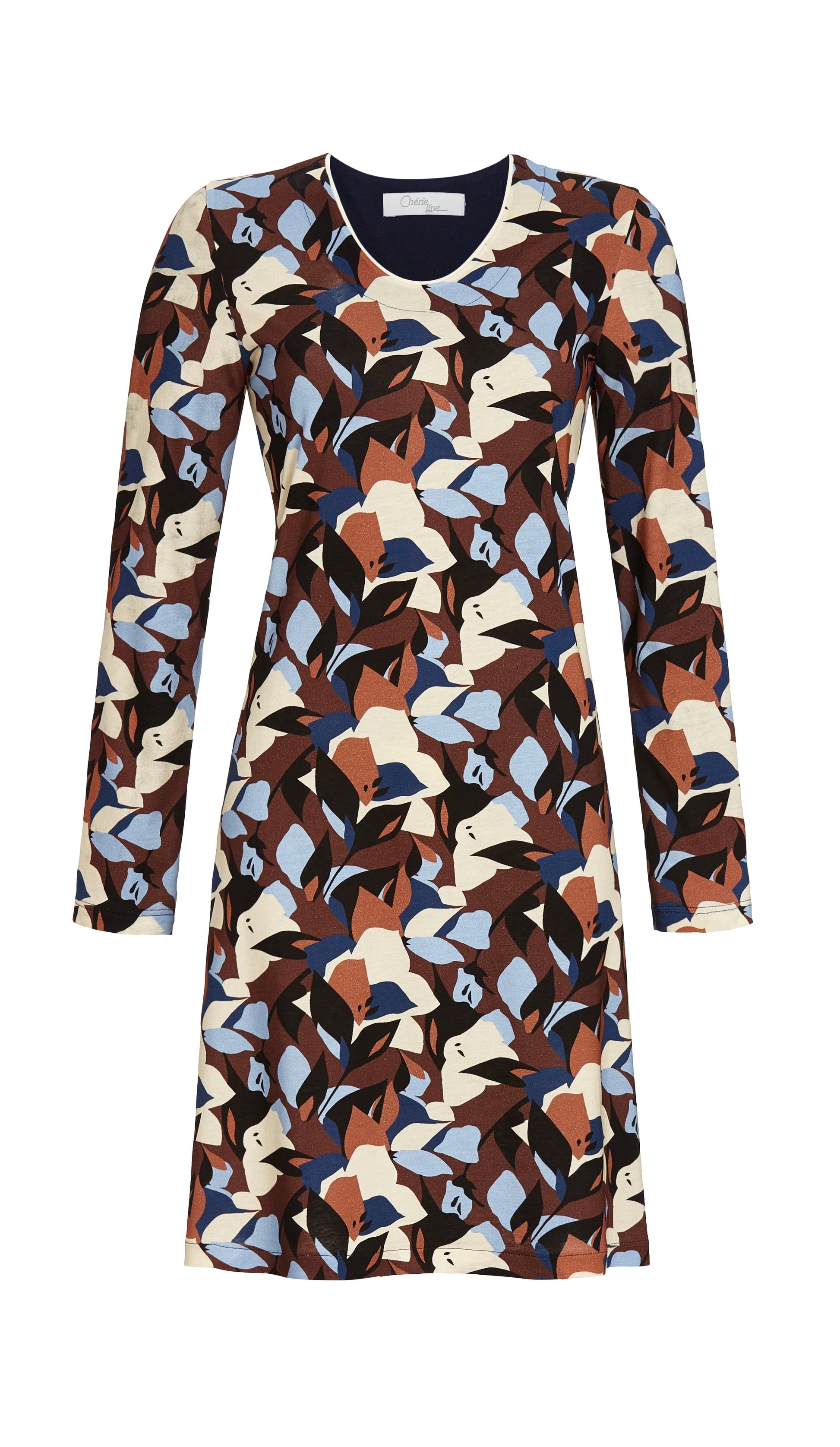 Een trendy, grafisch patroon zet vakkundig de toon voor dit model. De veelkleurige print maakt elk slaapshirt uniek. Afgewerkt met V-hals en contrasterende biezen. Het slaapshirt is gemaakt van een katoenen modal stof in single jersey kwaliteit en overtuigt met ademend vermogen en zijdezachte glans.