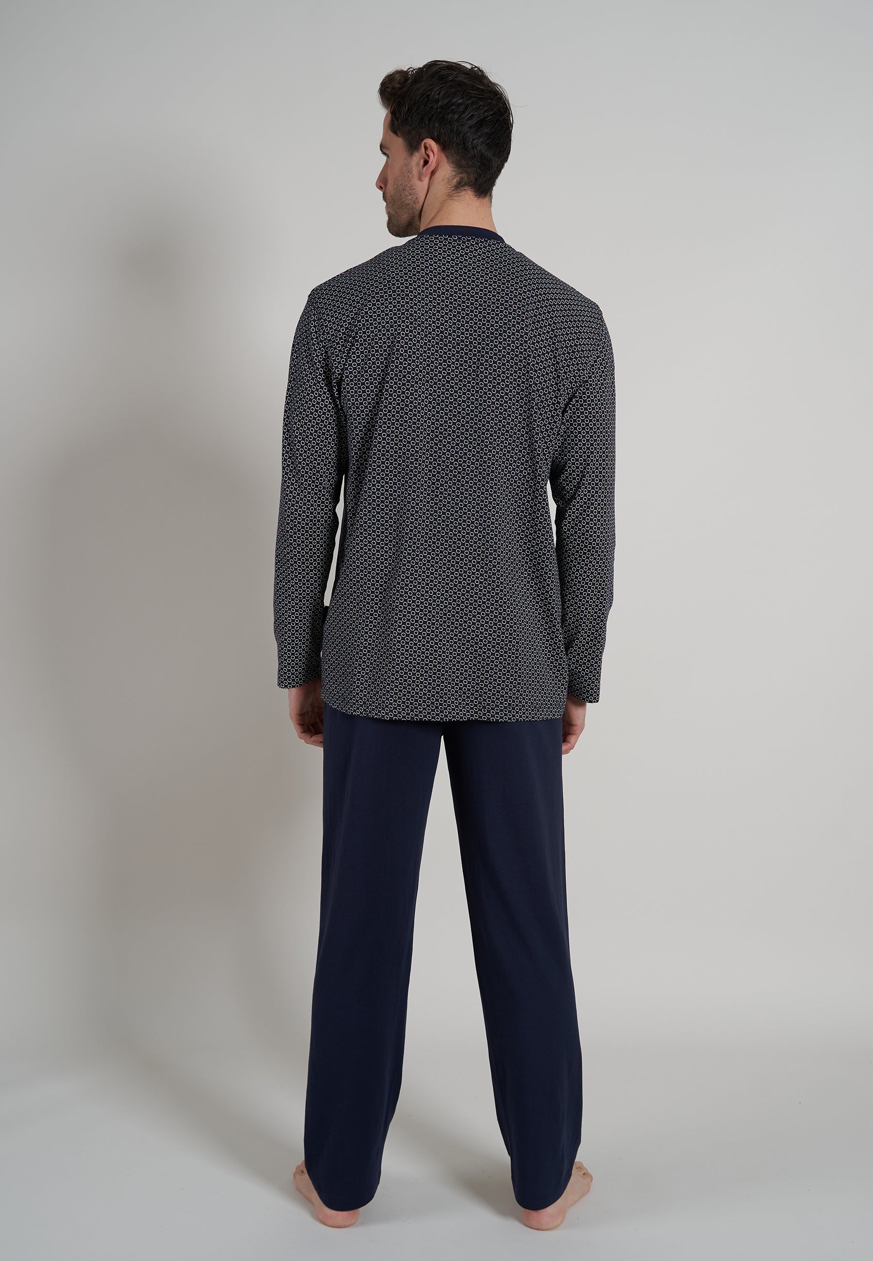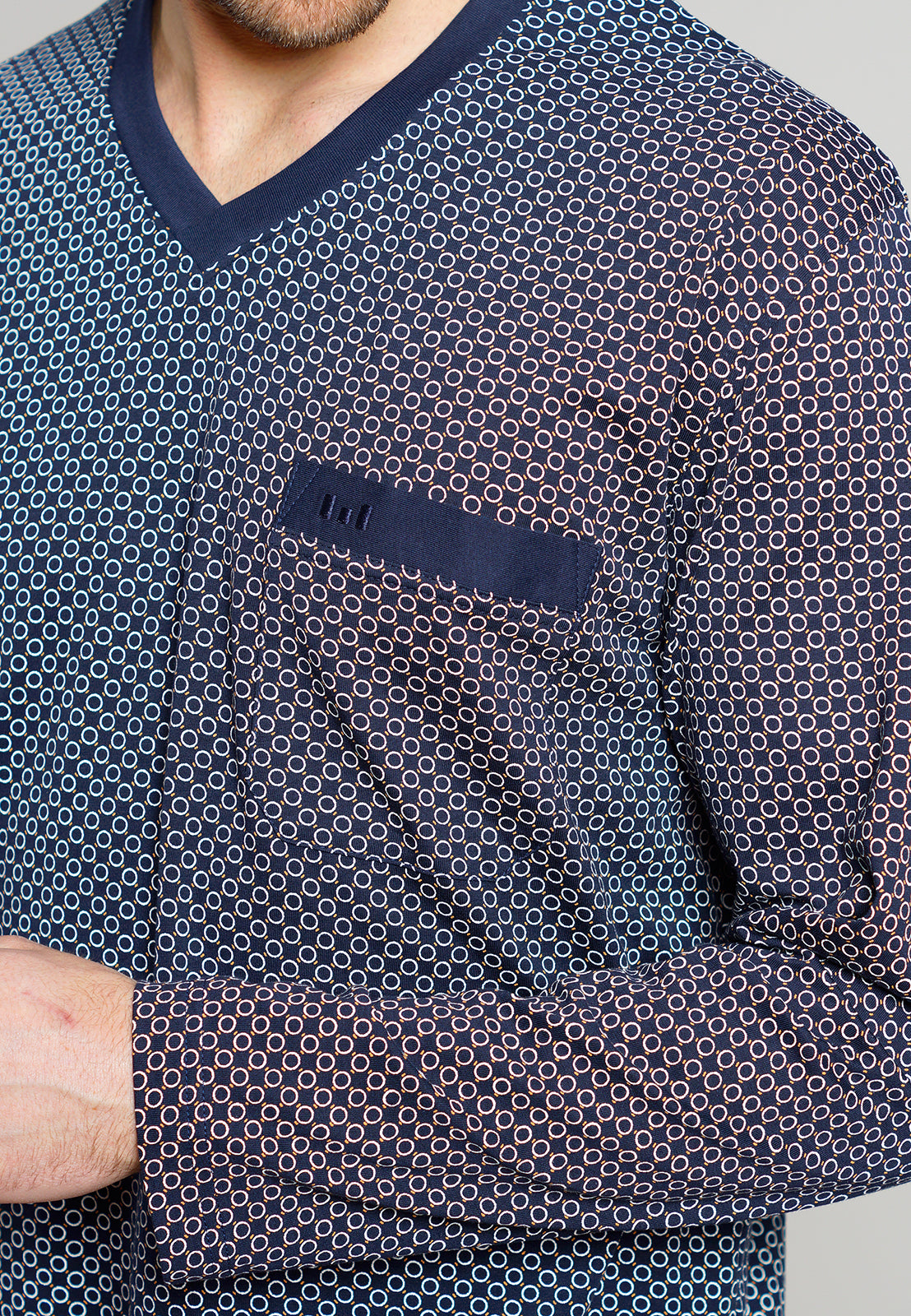 Heren pyjama van het merk Gotzburg. De top heeft lange mouwen en een V hals en een cirkel print. De broek is voorzien van een elastische tailleband. De set is gemaakt van 100% katoen.