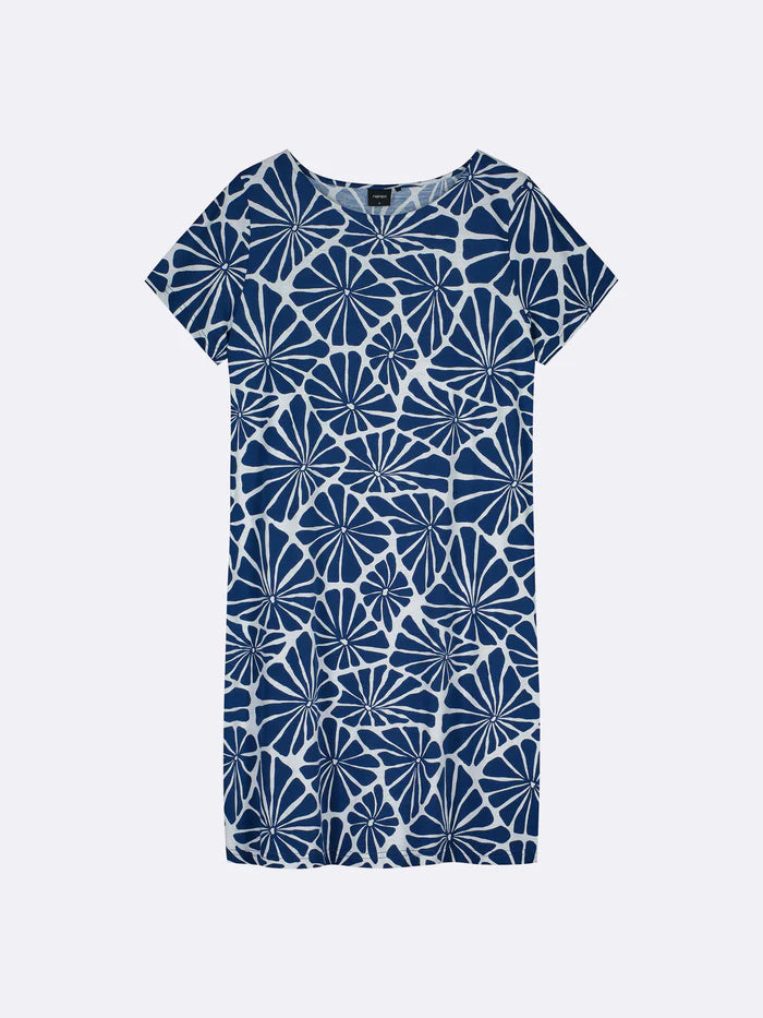 Blauw Aralia nachthemd met patroon voor dames met korte mouwen en ovale halslijn. De lengte van het nachthemd in maat M is ongeveer 95 cm. Het materiaal is een hoogwaardige, aangenaam zachte en onderhoudsvriendelijke katoenmodal die van wasbeurt tot wasbeurt goed blijft.