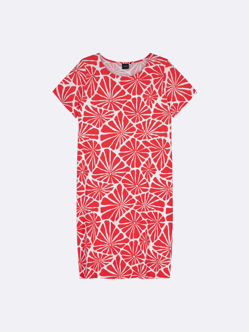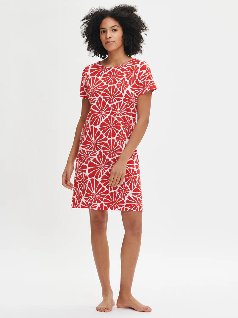 Rood Aralia nachthemd met patroon voor dames met korte mouwen en ovale halslijn. De lengte van het nachthemd in maat M is ongeveer 95 cm. Het materiaal is een hoogwaardige, aangenaam zachte en onderhoudsvriendelijke katoenmodal die van wasbeurt tot wasbeurt goed blijft.