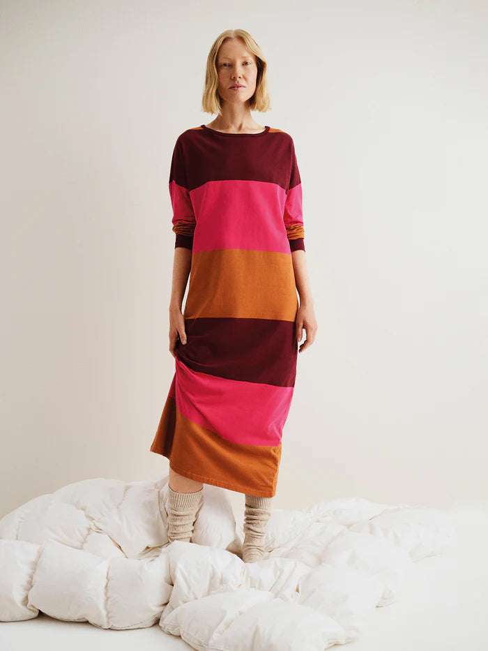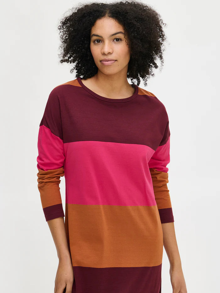 Dames gestreepte Trio nachthemd met lange mouwen en ronde hals. De halslijn van de casual nachthemd is afgewerkt met een monochrome rand. De lengte van de rechte nachthemd in maat M is ongeveer 130 cm. Het materiaal is hoogwaardig, aangenaam zacht en onderhoudsvriendelijk katoenen breisel dat van de ene wasbeurt naar de andere goed blijft. Het breisel is gemaakt van gecertificeerd katoen.