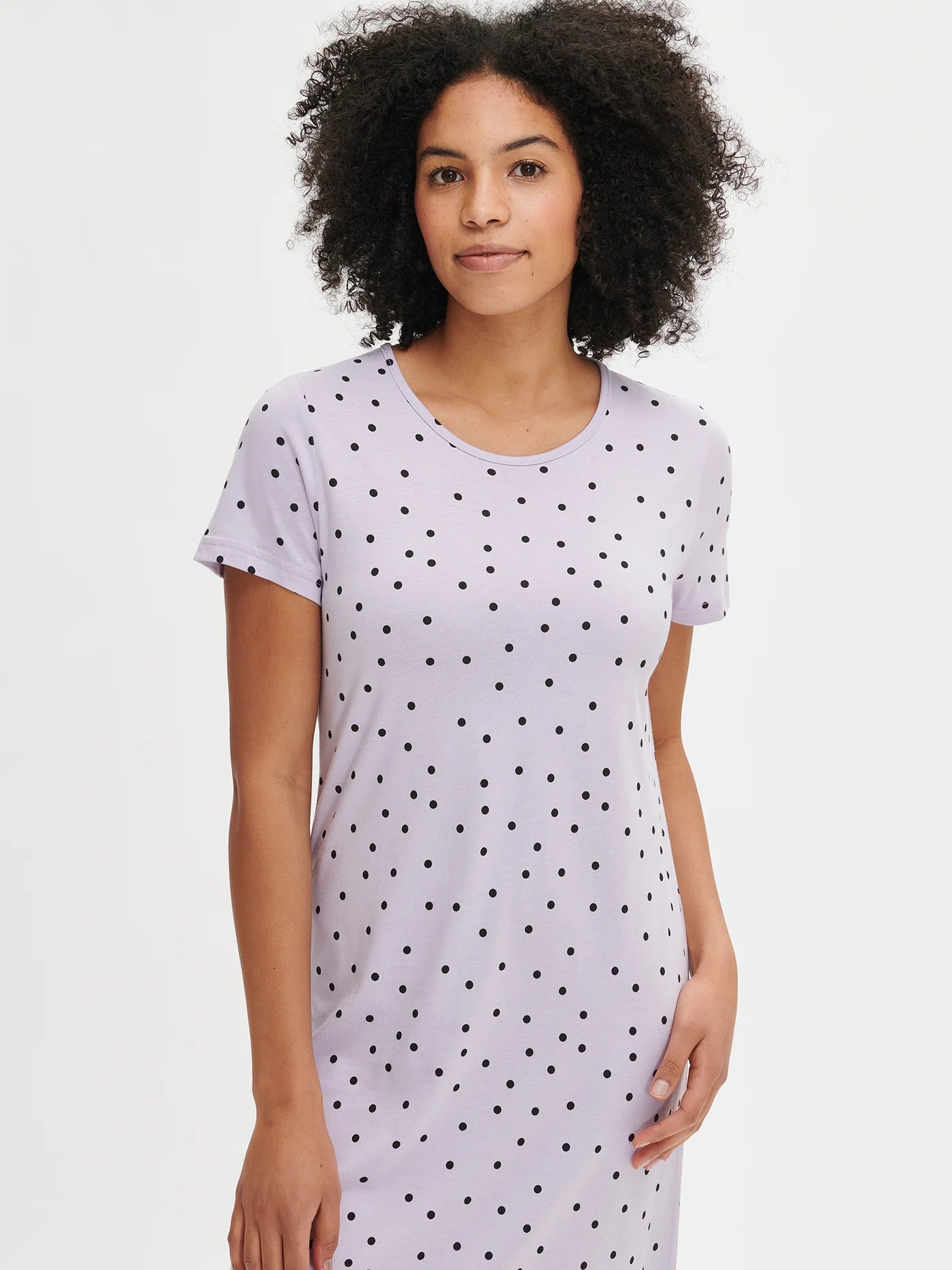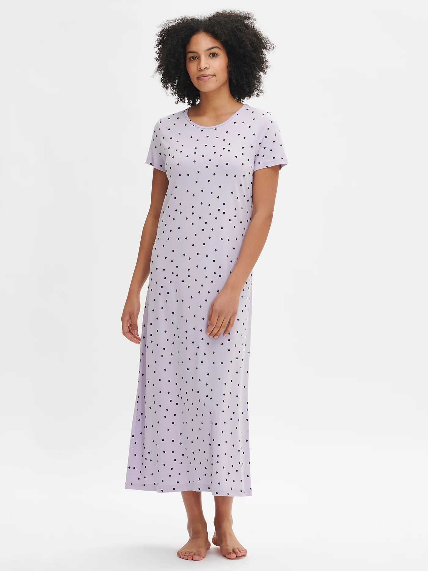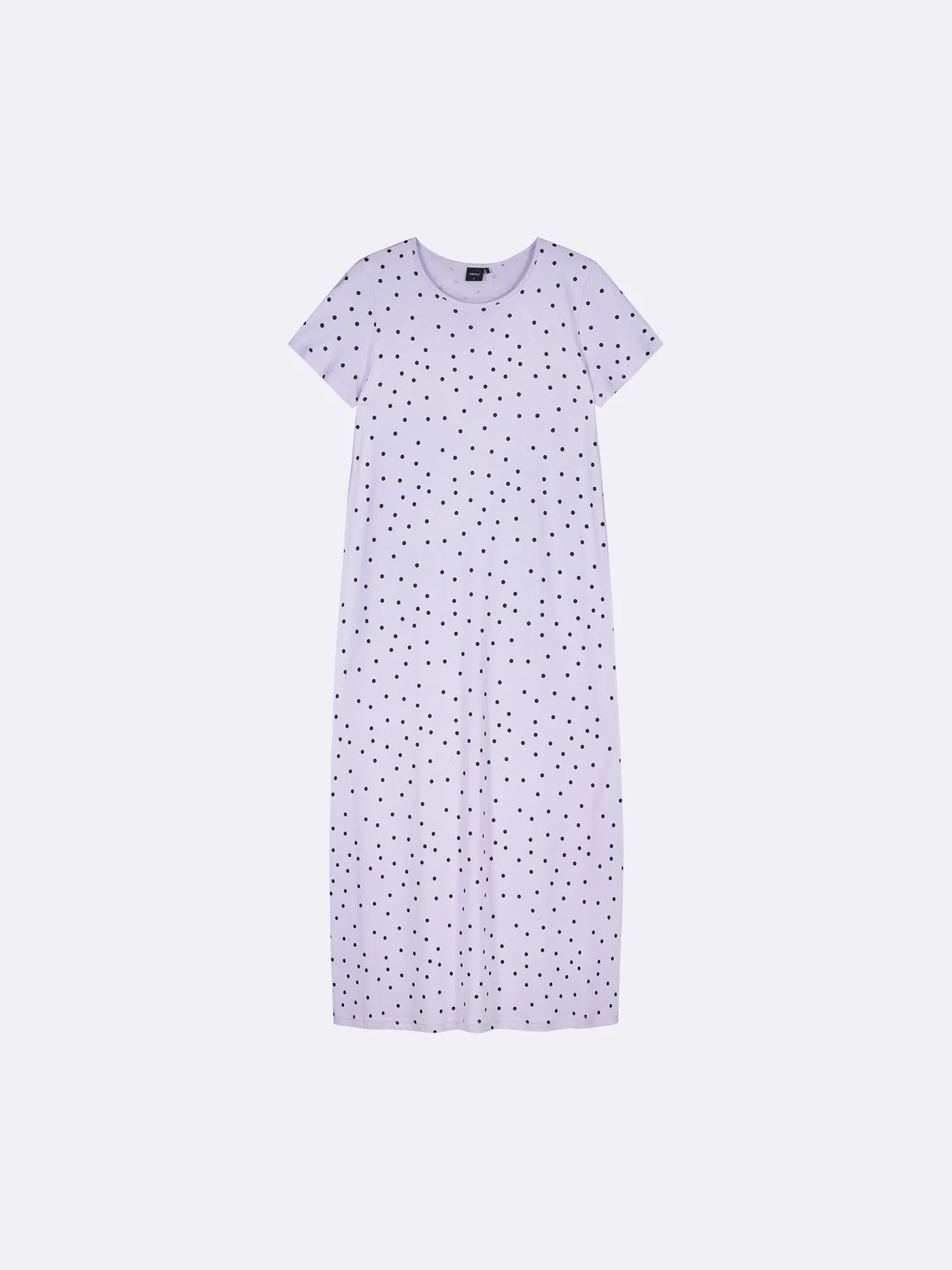 Pallo lang nachthemd voor dames met korte mouwen en ronde halslijn. De ondergrond heeft een lila kleur met een stippenpatroon. De lengte van het nachthemd in maat M is ongeveer 130 cm. Het materiaal is hoogwaardig, aangenaam zacht op de huid en gemakkelijk te onderhouden voor katoenmodal, dat van wasbeurt tot wasbeurt goed blijft.