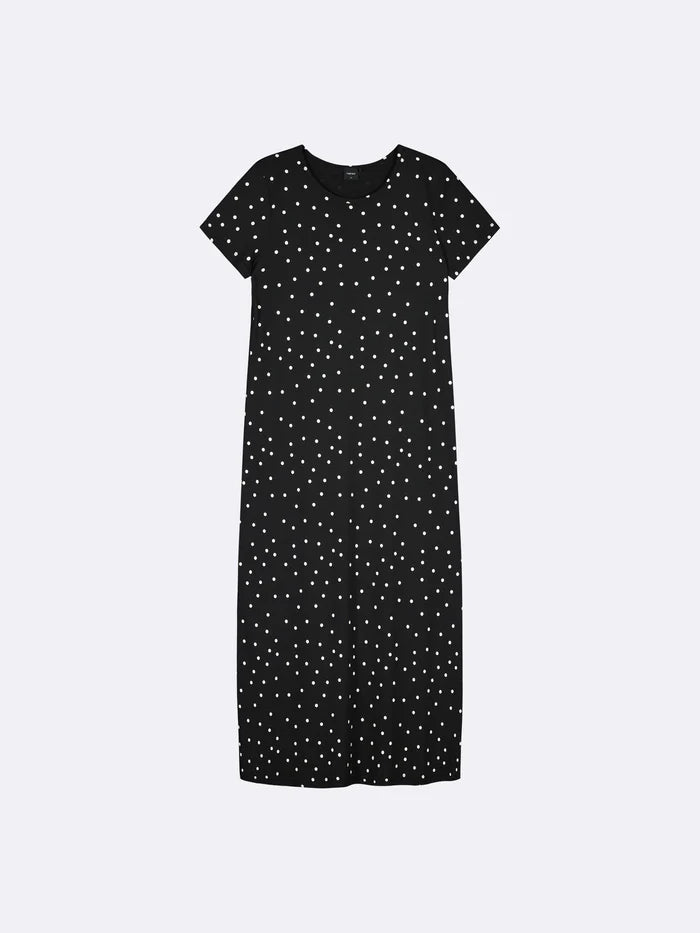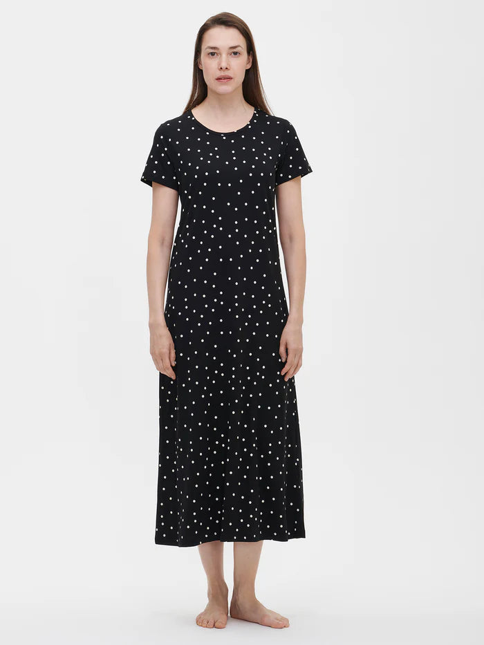 Pallo lang nachthemd voor dames met korte mouwen en ronde halslijn. De ondergrond heeft een zwarte kleur met een stippenpatroon. De lengte van het nachthemd in maat M is ongeveer 130 cm. Het materiaal is hoogwaardig, aangenaam zacht op de huid en gemakkelijk te onderhouden voor katoenmodal, dat van wasbeurt tot wasbeurt goed blijft.