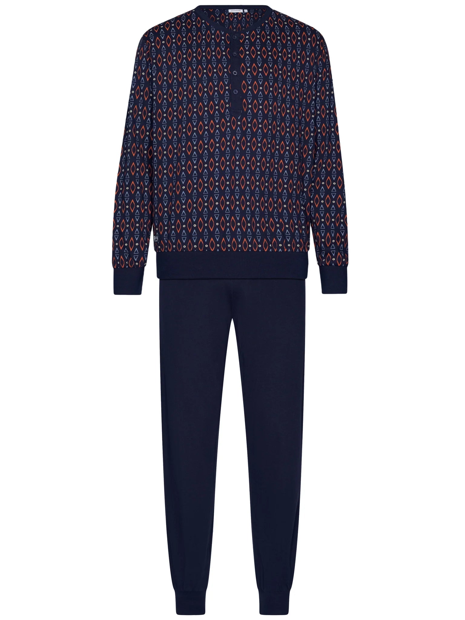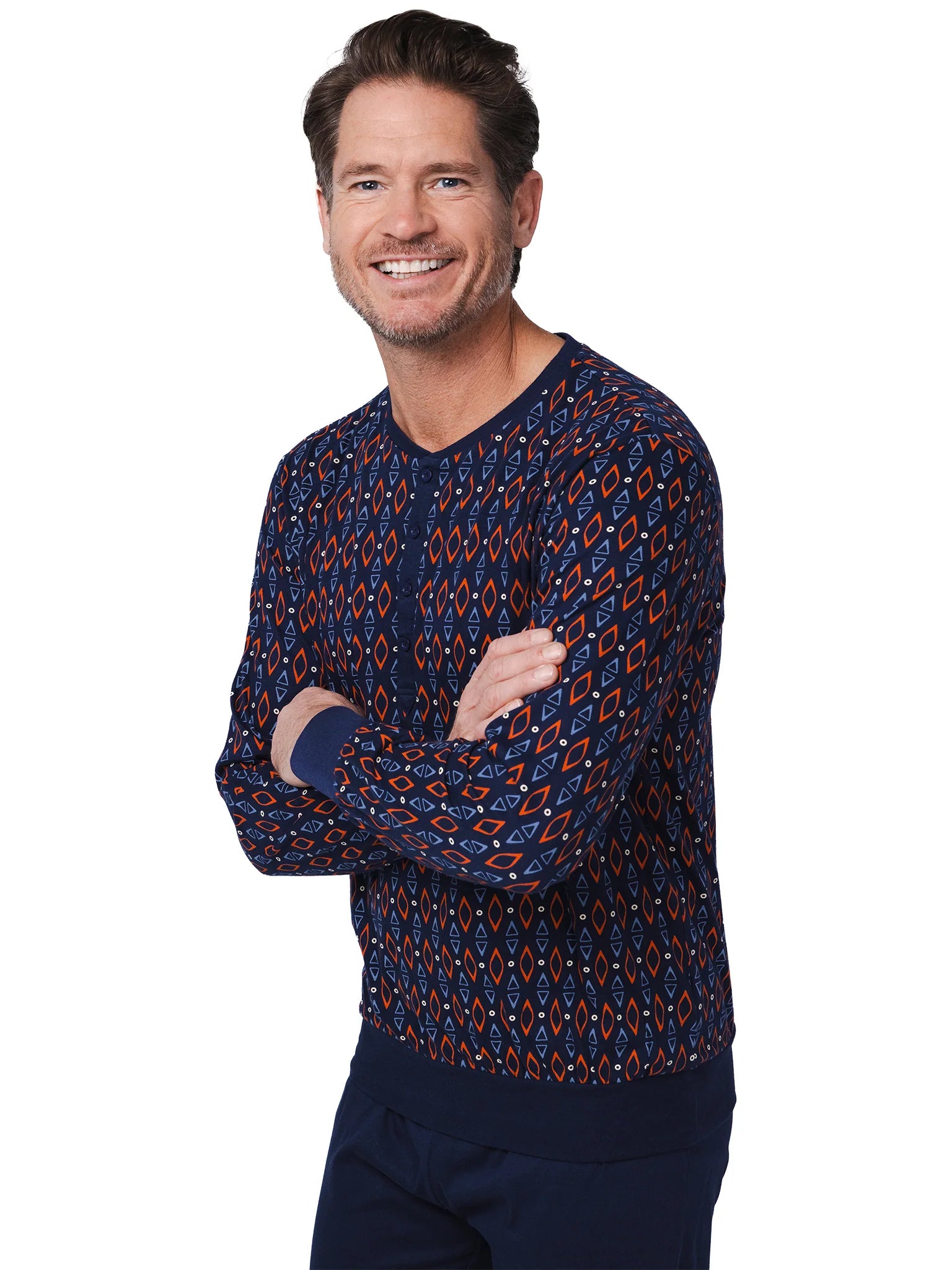 De top is donkerblauw van kleur en heeft een grafische print in lichtblauw, wit en oranje. De top heeft lange mouwen, een ronde hals met knoopsluiting en boordjes aan de mouwen en onderkant. De lange broek is uni donkerblauw van kleur en heeft een elastische tailleband en boordjes voor een optimale pasvorm. Daarnaast heeft de broek een achterzak.