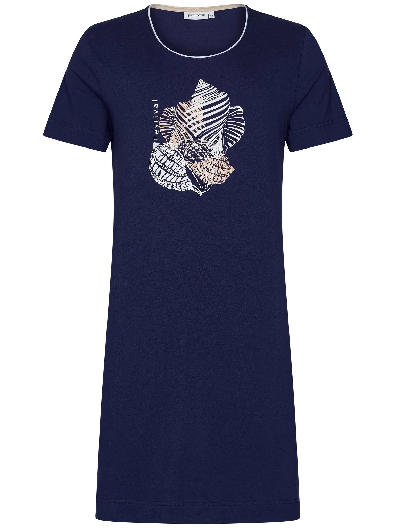 Het nachthemd heeft een mooie donkerblauwe kleur en is voorzien van een grote print van verschillende schelpsoorten in witte en lichtbruine tinten. Het nachthemd heeft korte mouwen en een ronde hals, met een leuke witte afwerking rondom de hals voor een extra detail.