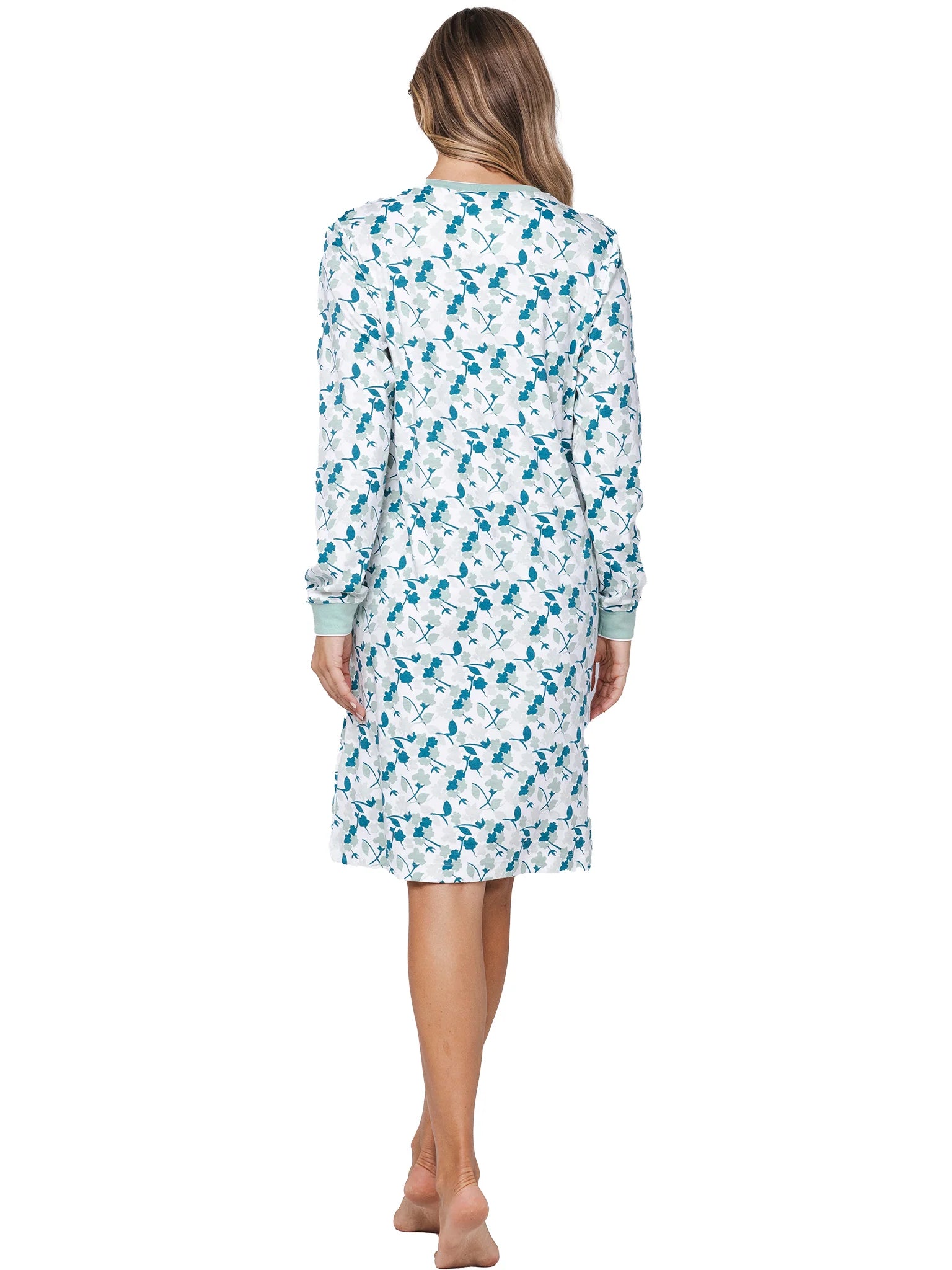 Het nachthemd is wit van kleur en heeft een verfijnde bloemenprint in groentinten. Het nachthemd heeft lange mouwen, een ronde halslijn met een knoopsluiting. Een mooi detail is de uni groene ribafwerking aan de hals en mouwen, wat zorgt voor een stijlvolle en comfortabele uitstraling.