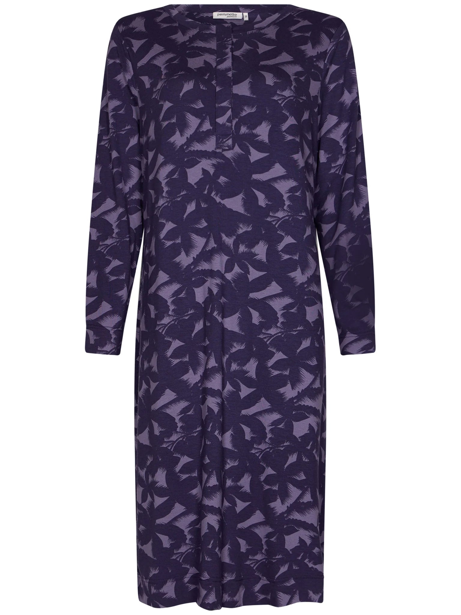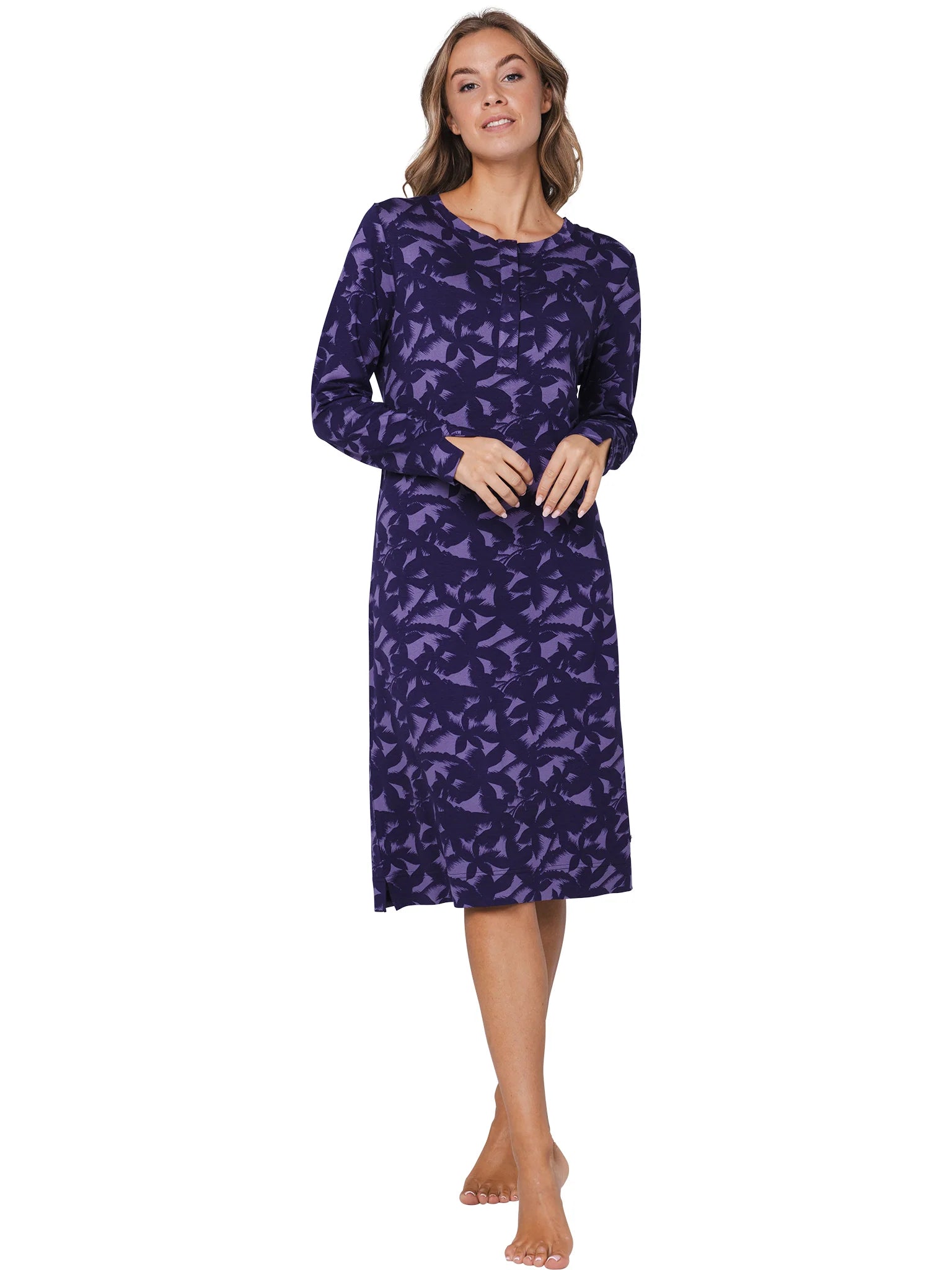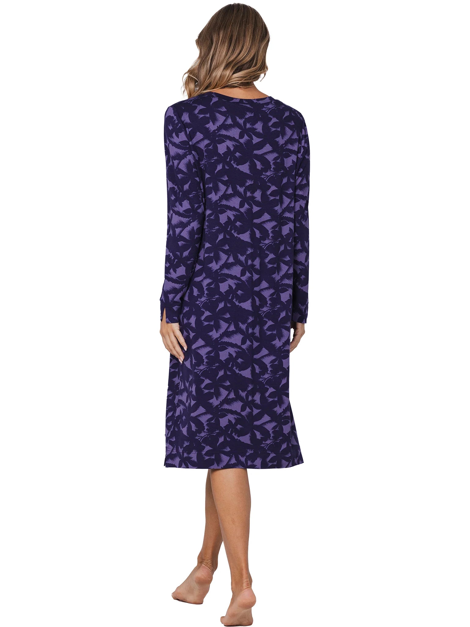 Het nachthemd is uitgevoerd in een diepe donkerpaarse kleur en voorzien van een verfijnde bloemenprint. Het model heeft lange mouwen, een ronde hals en een praktische knoopsluiting. Subtiele details, zoals de elegante slits in de mouwen en aan de onderkant, geven dit nachthemd een stijlvolle en vrouwelijke uitstraling.