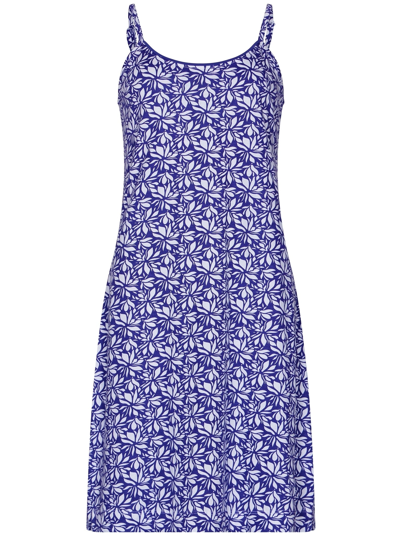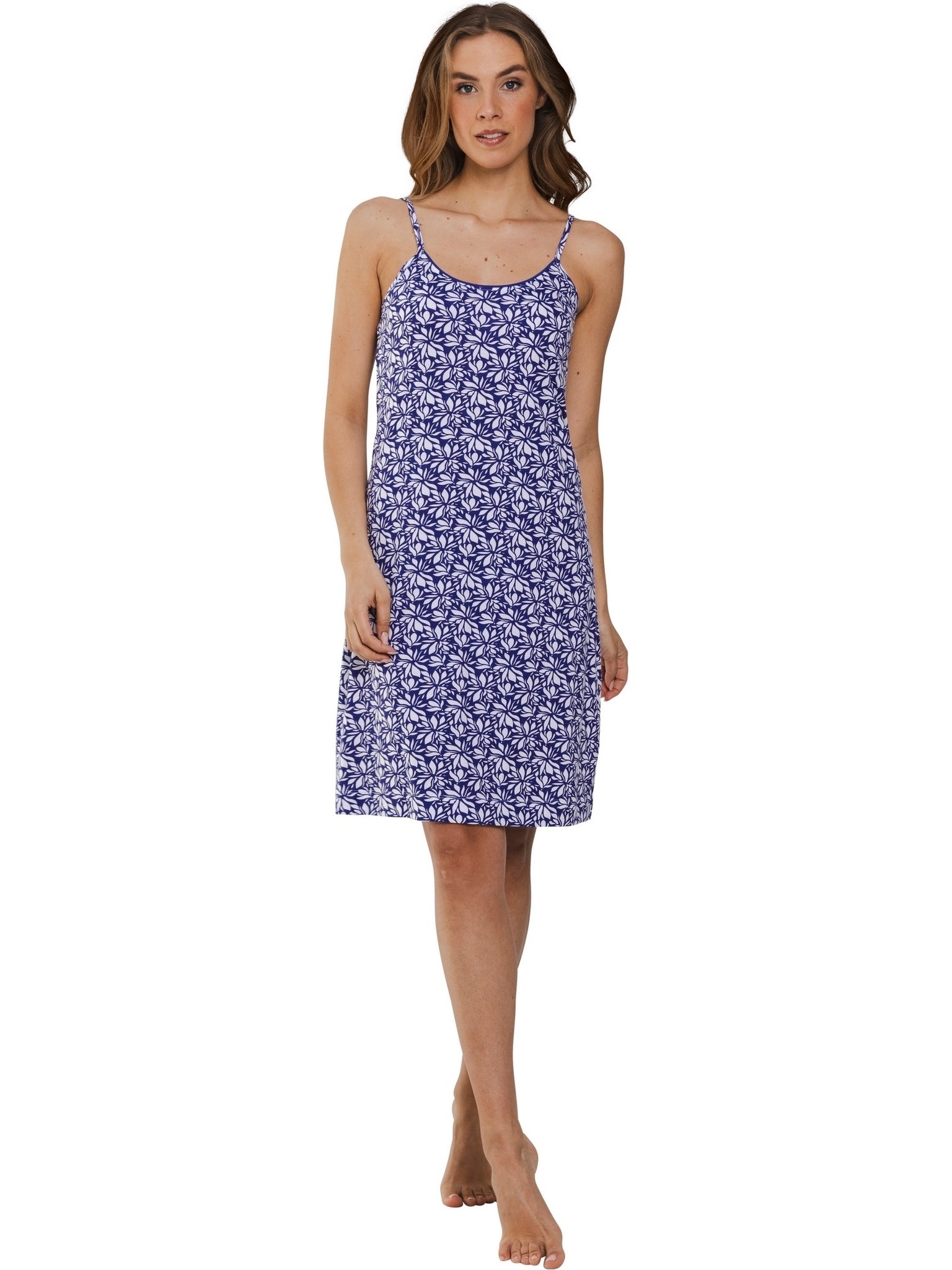 Het spaghetti nachthemd is indigo blauw van kleur heeft een fleurig bloemen print in de kleuren wit en indigoblauw. Het nachthemd heeft een ronde hals. De lengte van deze spaghettidress is 95 cm. Het nachthemd is gemaakt van 100% katoen en op een speciale manier verwerkt zodat het nog zachter is. Katoen voelt natuurlijk aan op je lichaam. Het is zacht, soepel, en sterk vocht absorberend, wat je nachtrust zeer ten goede komt. Verder is het gemakkelijk in onderhoud en slijtvast.