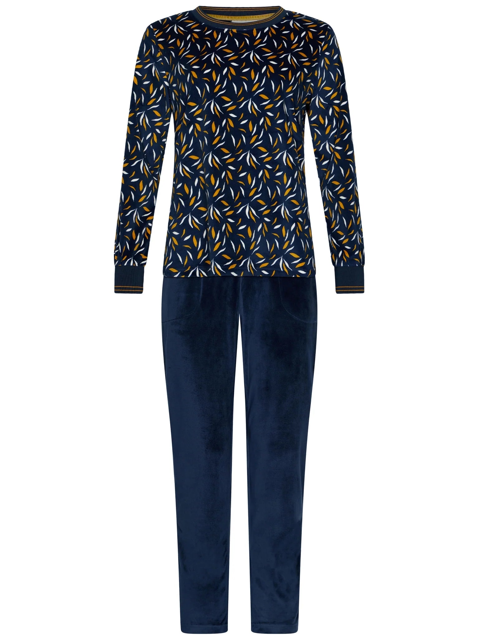 De top is donkerblauw van kleur met een allover fantasie bloemen dessin in okergeel en wit. De top heeft een ronde hals en is afgewerkt met gele lijnen aan de hals en de boorden van de mouwen, wat zorgt voor een luxe uitstraling. De bijpassende broek is uni donkerblauw van kleur, heeft een elastische tailleband voor een optimale pasvorm en is voorzien van praktische steekzakken.