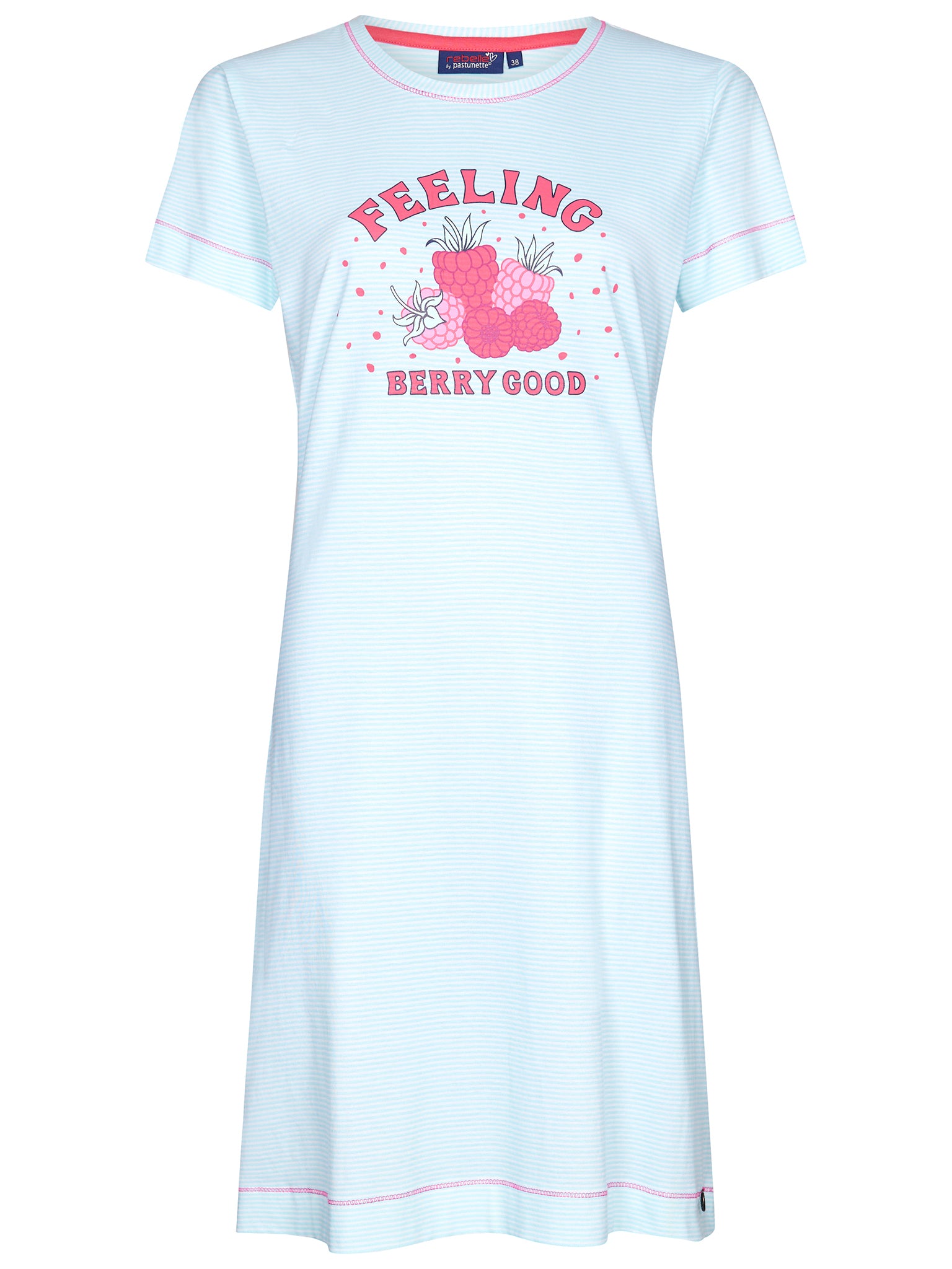 Dit nachthemd is van het merk Rebelle heeft korte mouw. Het nachthemd met ronde hals heeft een opdruk van frambozen met de tekst Feeling Berry Good. Het materiaal is gemaakt van 100% katoen.