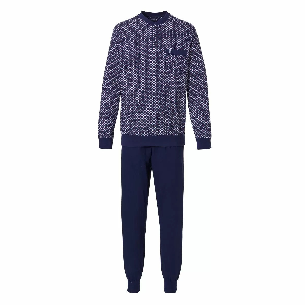Deze pyjama van het bekende merk Robson is een geslaagde creatie. Het shirt met een motief van blauwe en rode details heeft onder de hals een rijtje knoopjes. Gecombineerd met een lange broek in Uni donker blauw. Het hoogwaardige katoen laat een fijn gevoel achter op de huid en maakt de pyjama al snel tot een absoluut favoriet stuk.
